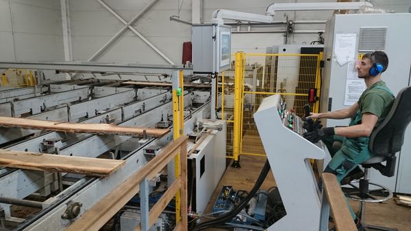 Nach dem Fällen und dem Einschnitt der Bretter aus dem Stamm wird die Eiche mindestens 1/4 Jahr im Aussenbereich luftig gelagert. Dann erfolgt der grobe parallele Zuschnitt der Bretter mit einer hochmodernen, aber von Menschen gesteuerten Anlage. Hier geht es um die effiziente Ausnutzung des Rohstoffes, damit nur wenig verloren geht.